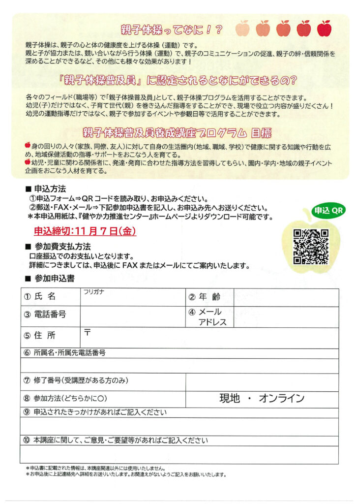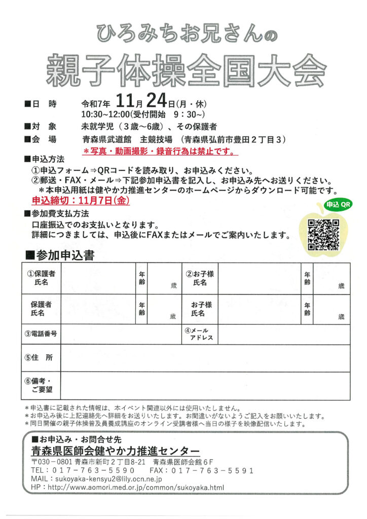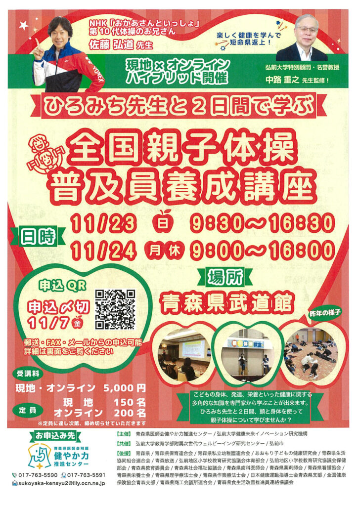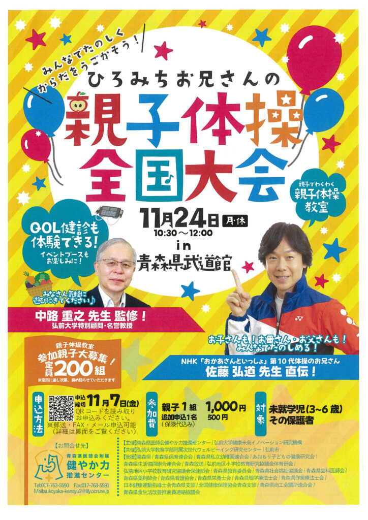 青森県医師会健やか力推進センターでは、親子の健康づくりをテーマに「全国親子体操普及員養成講座」と「親子体操全国大会」を開催します。