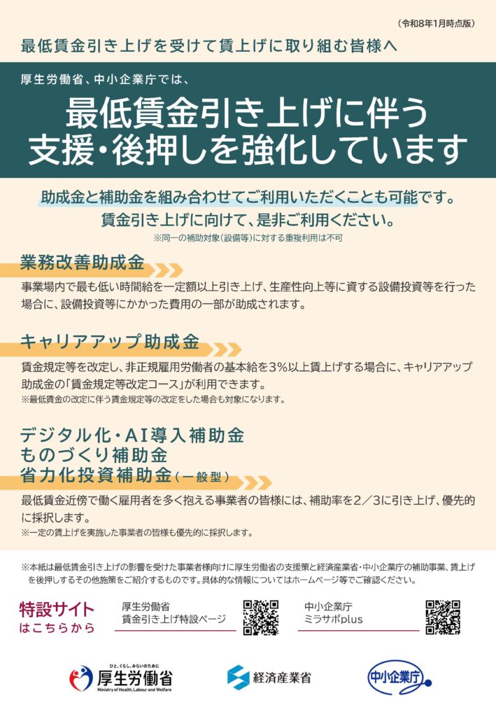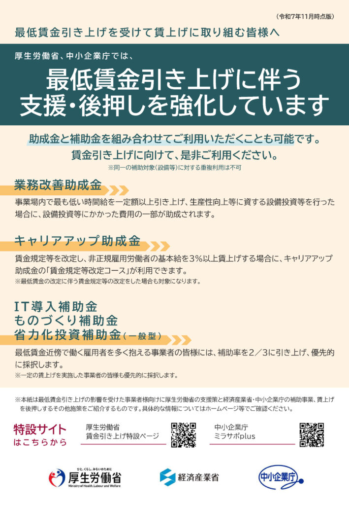 令和7年の最低賃金は、過去に例のない高水準となり、全国加重平均で66円引き上げられました。中小企業・小規模事業者の賃金向上の推進に関する国の支援策をご紹介します。