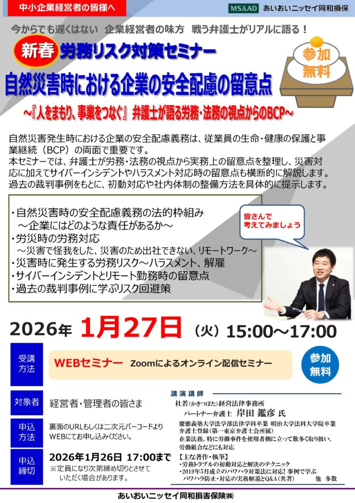 本セミナーでは、弁護士が労務・法務の視点から、災害対応だけでなくサイバーインシデントやハラスメント対応の留意点まで具体的に解説します。